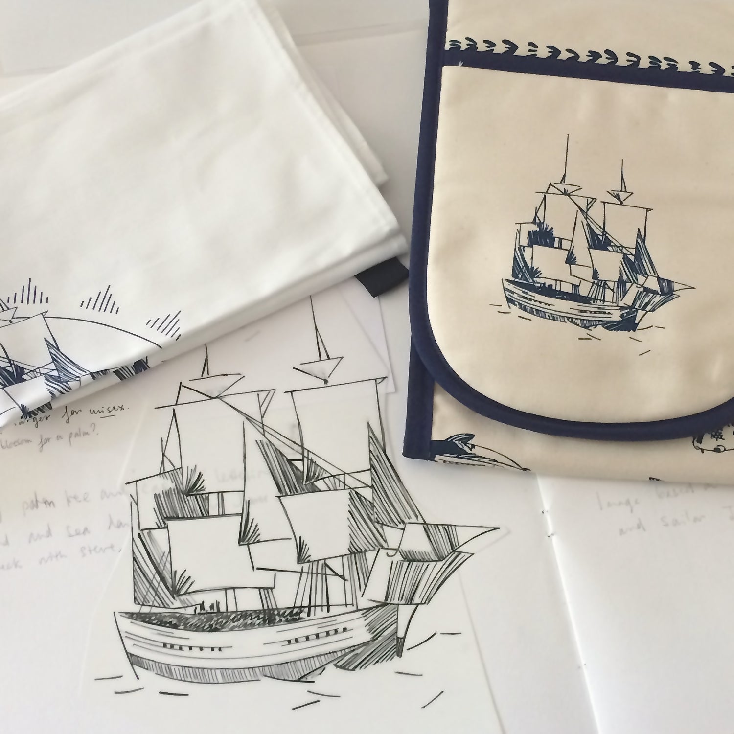 The design process takes place in a small studio and is generated by original sketchbook ideas. We start with a drawing and build up tones through use of line or under-painting and then apply a limited colour palette. This is refined into a final proof in a digital format, from which a supplier generates the final product.